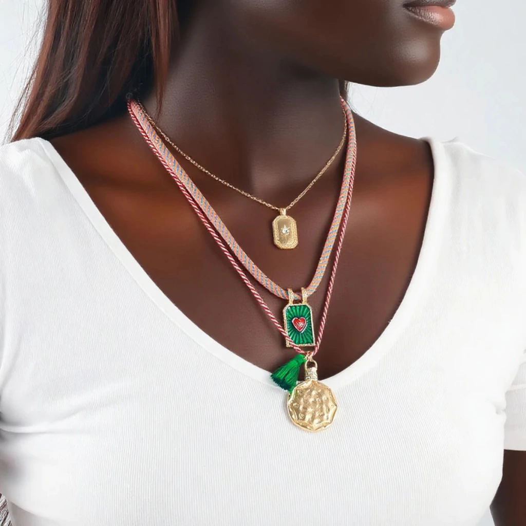 Os detalhes em verde e dourado trazem um toque vibrante e sofisticado, enquanto o pingente em medalha martelada e o tassel verde adicionam charme artesanal e estilo contemporâneo.